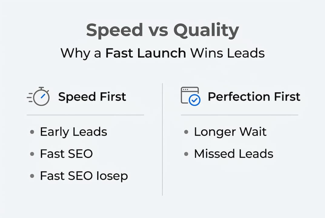 The lesson isn't "ship garbage." The lesson is that progress compounds. An early launch gives you real data: which pages get traffic, which keywords bring calls, which service areas convert. That data shapes every improvement you make after launch. Waiting for perfection means you're optimizing in a vacuum. Launching fast means you're optimizing with real feedback.